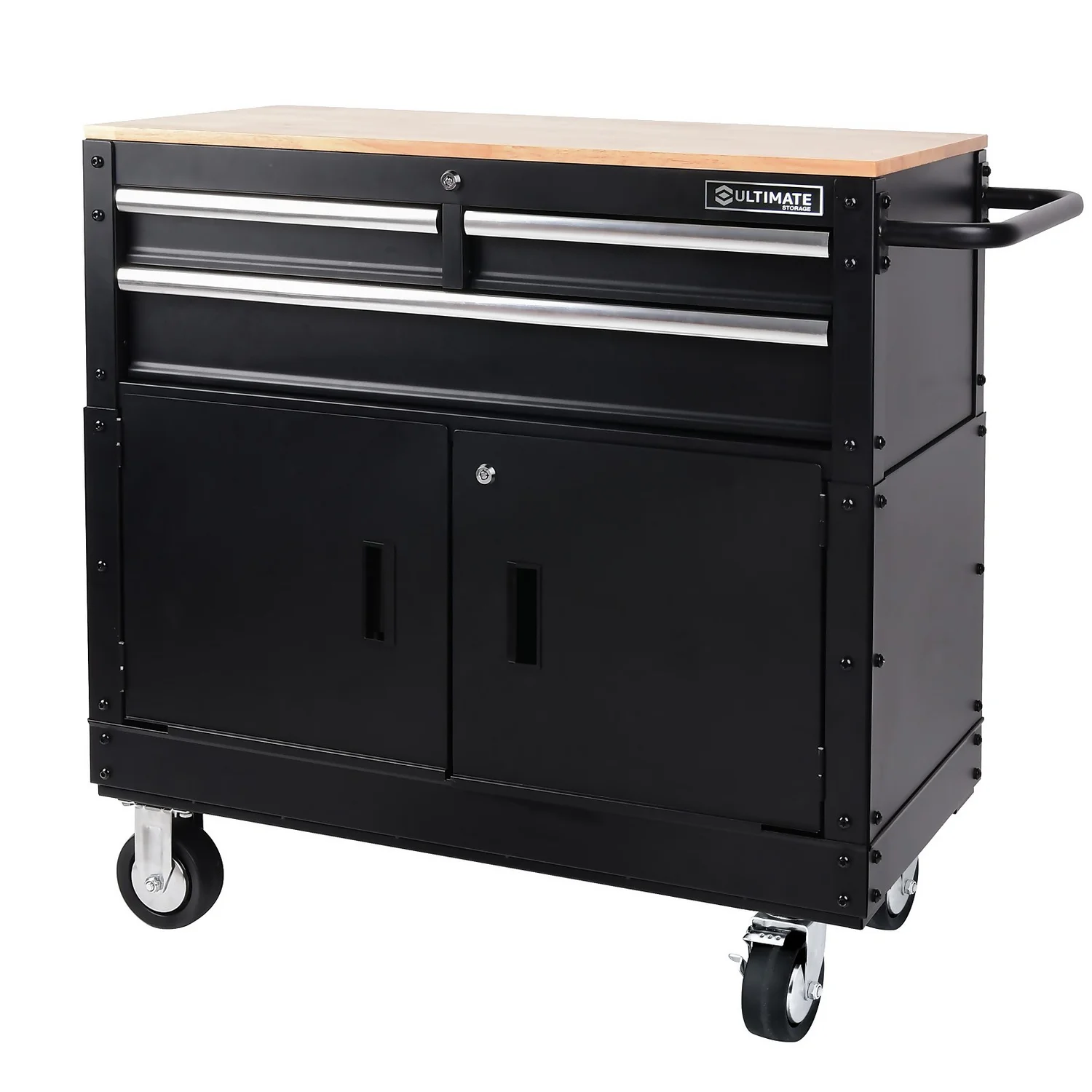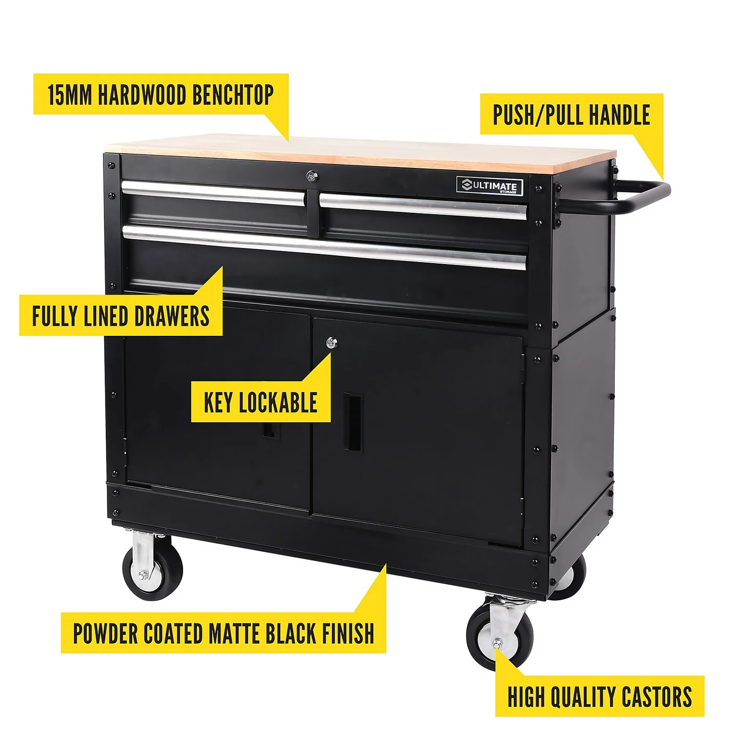 This Ultimate Tool Trolley is a necessity in the tool shed and workplace. With a handy drawer and cupboard combination, this trolley provides ample space to organise and store tools. A stylish alternative in tool storage, this tool trolley is modern and versatile with a black powder coat finish and solid rubberwood benchtop. All drawers are fully lined and are key lockable to keep your gear safe and secure.