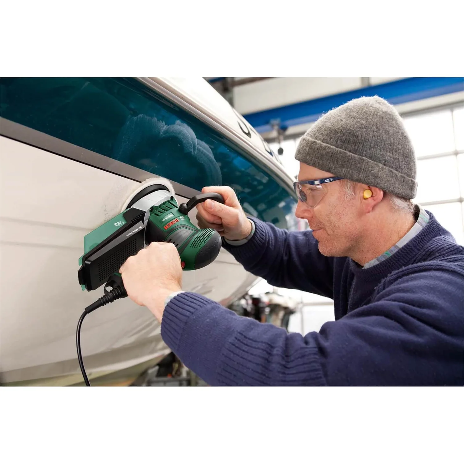 The Bosch PEX 400 AE random orbit sander is a part of the Bosch Expert series, which is designed to meet the requirements of experienced and discerning DIYers. It sits securely and comfortably in the hand due to its ergonomic design with soft grip coverings, making it convenient working. Variable speed pre-selection for material-specific working which is great when working on varnished surfaces: when selecting a low speed, the surface will not get too hot and the paint on a work piece will not burn.