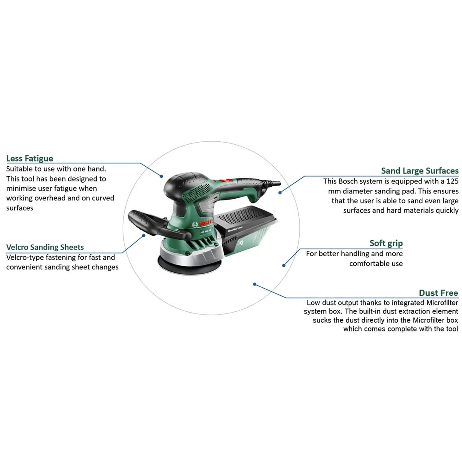 | Product Contains | 11 x Bosch PEX 400 AE Eccentric Disc Sander, 1 x Sanding Sheet DIA 125 K 80, 1 x Paper Assistant, 1 x auxiliary handle, 1 x Micro-filter Dust Container, 1 x instruction manual and 1 x plastic carrying case |