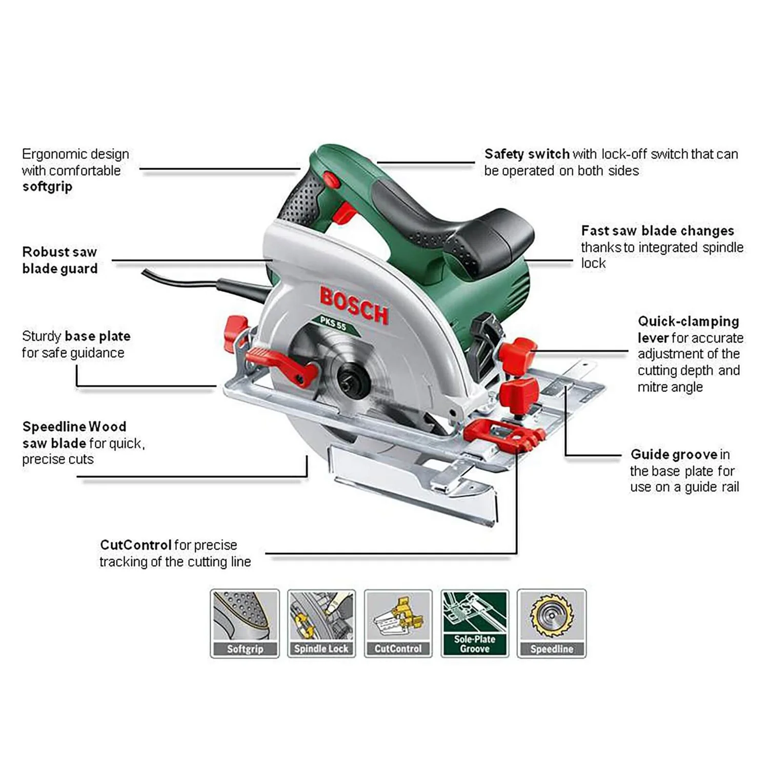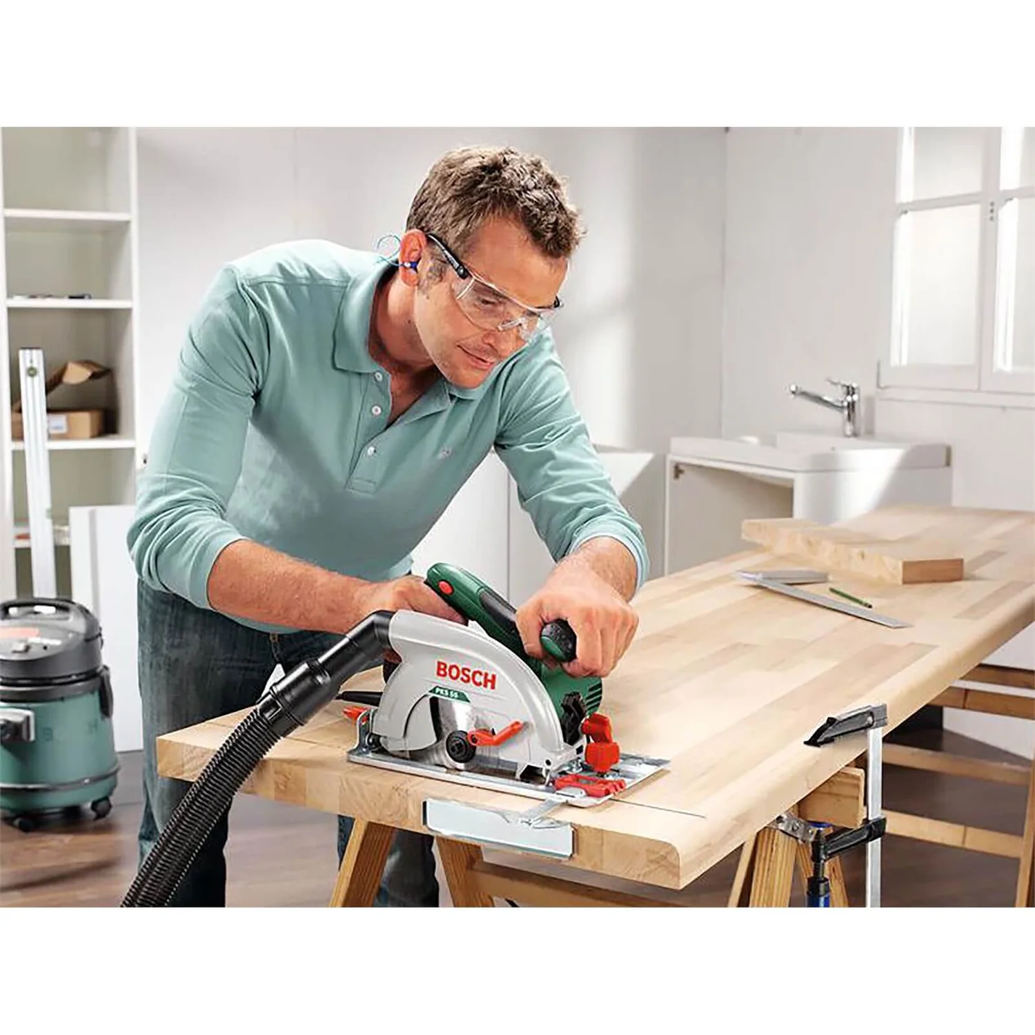 The Bosch PKS 55 is a powerful circular saw ideal for accurate and precise cutting. Ideal for kitchen worktops, decking boards, and wooden floorboards. The tool is lightweight and ergonomic in design and this allows it to be manoeuvred easily and safely, weighing only 3.9kg.