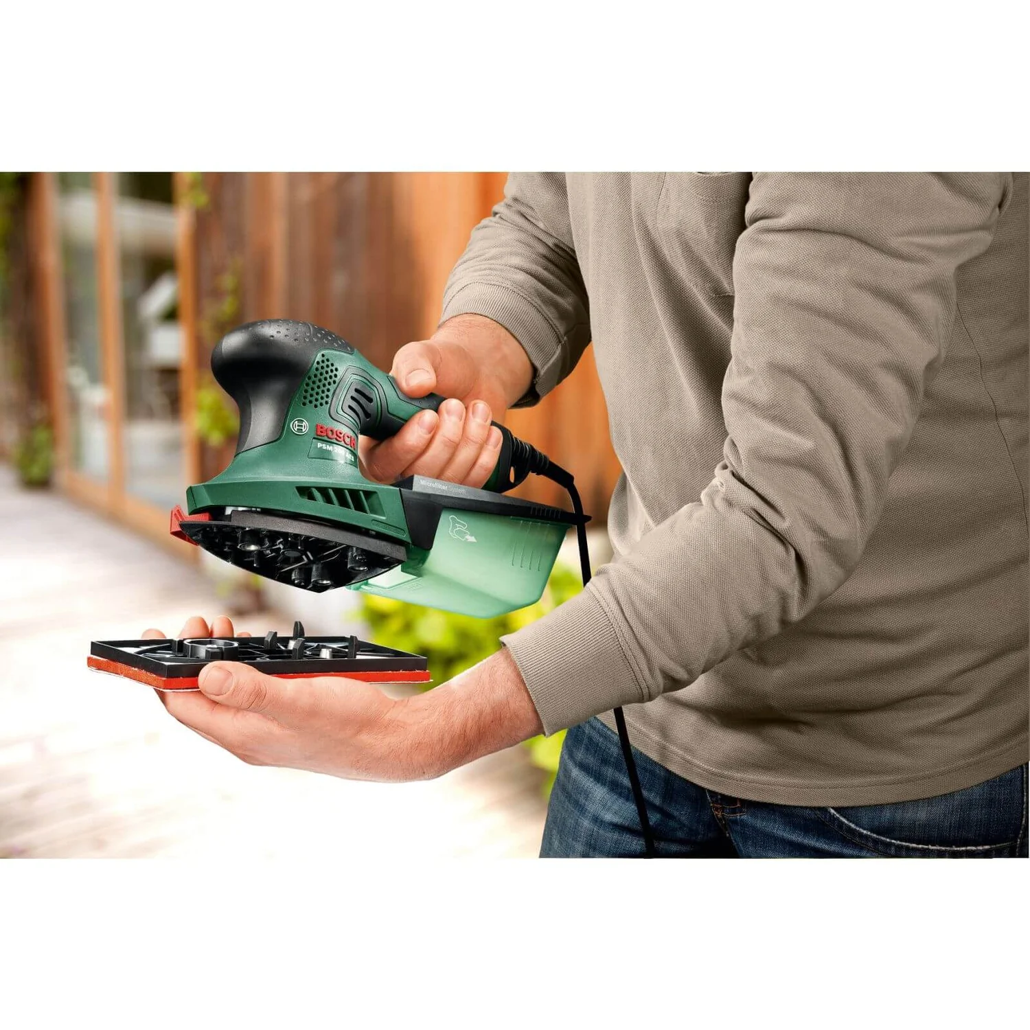 The Bosch PSM 200 AES multi sander is ideal for sanding flat surfaces, close to edges and into corners such as tables, benches and door frames. The tool is a versatile and powerful all-round sander that weighs just 1.4 kilograms, and features a particularly lightweight design. Equipped with a powerful 200 watt motor, it is also able to tackle larger DIY tasks with ease.