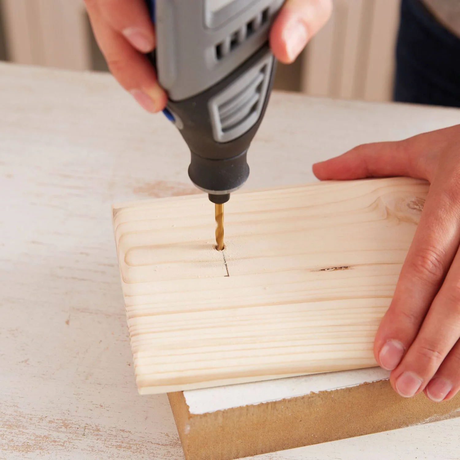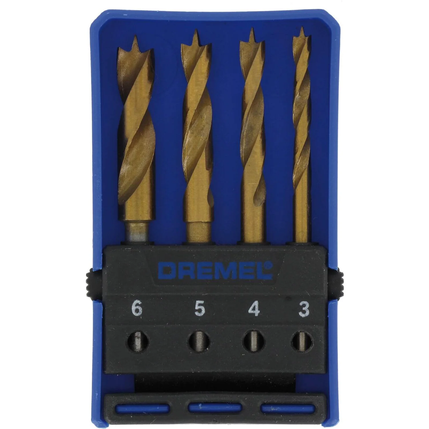 Dremel Wood Drill Bit Set contains 4 drill bits with centering point for drilling into wood. The titanium coating offers high performance and longer lifetime.