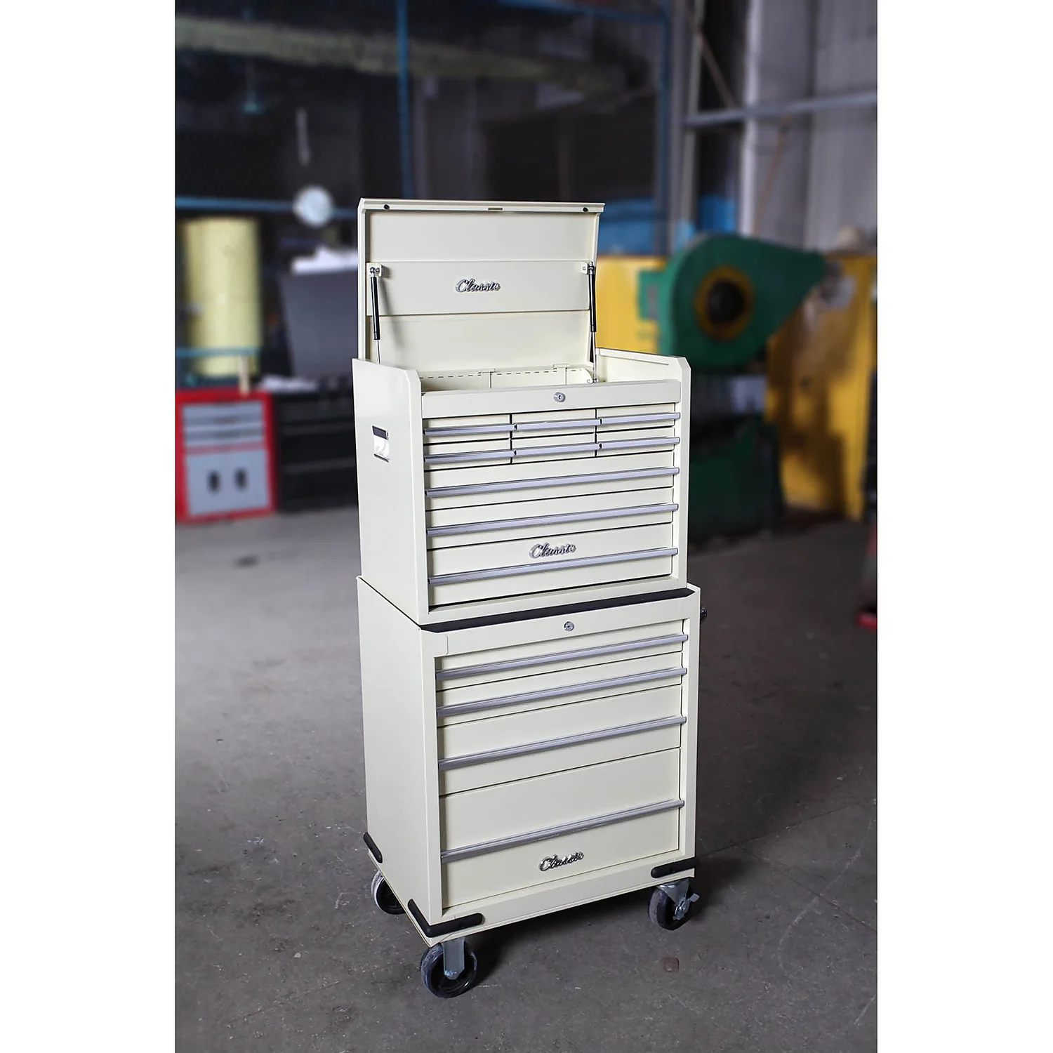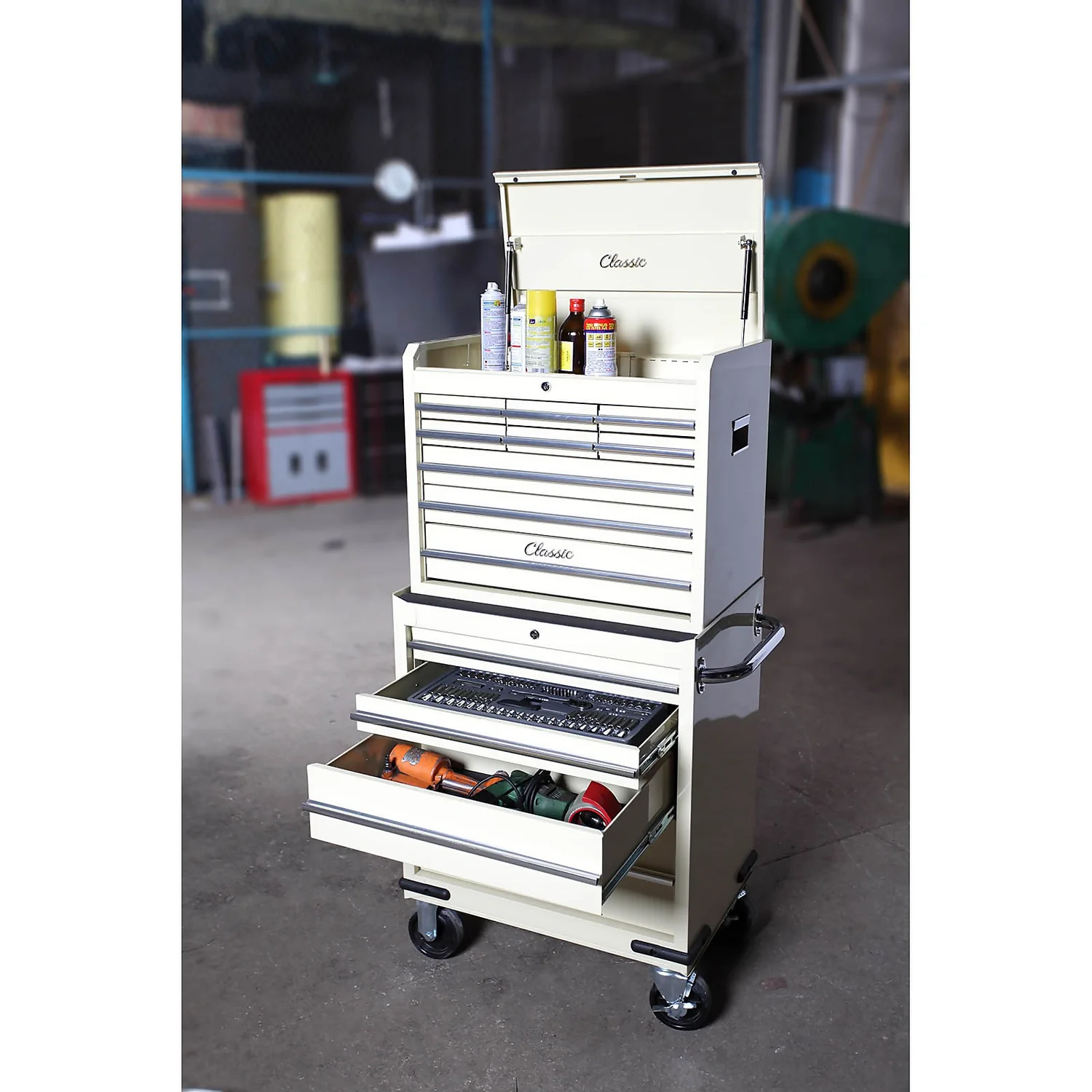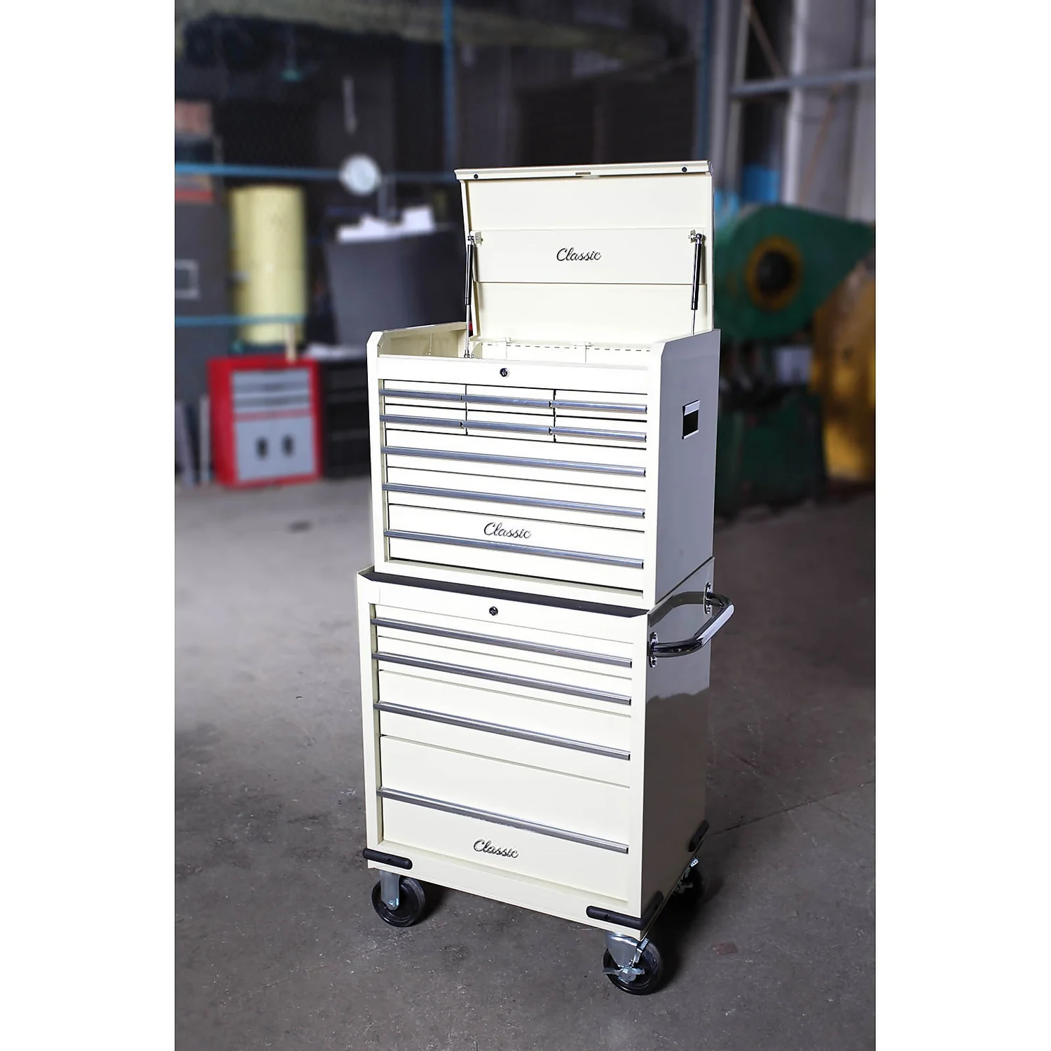 - Classic 26″ combination unit design to suit classic car owners and car enthusiasts with gas struts, lift latch, 5″ locking castors and lockable ball bearing drawer slides for a smooth secure operation