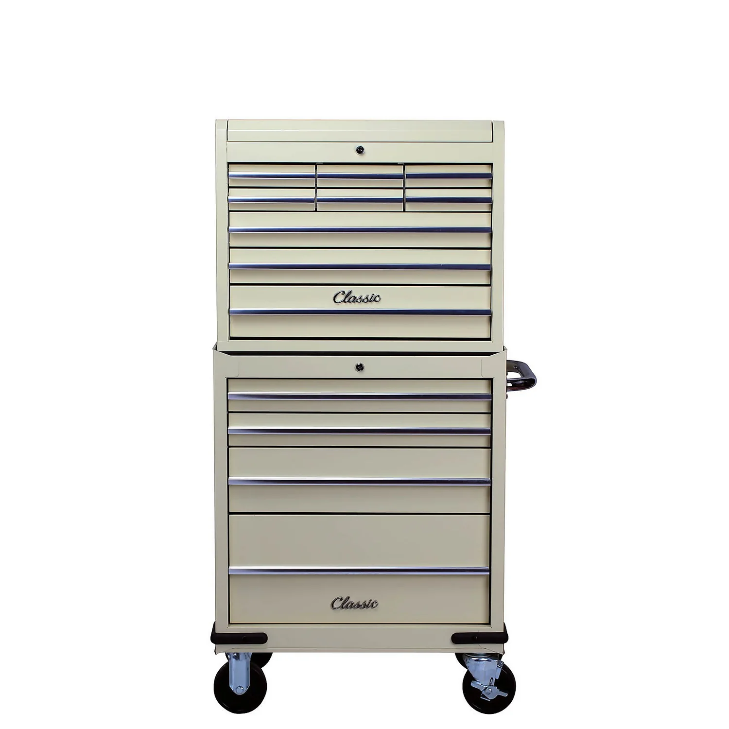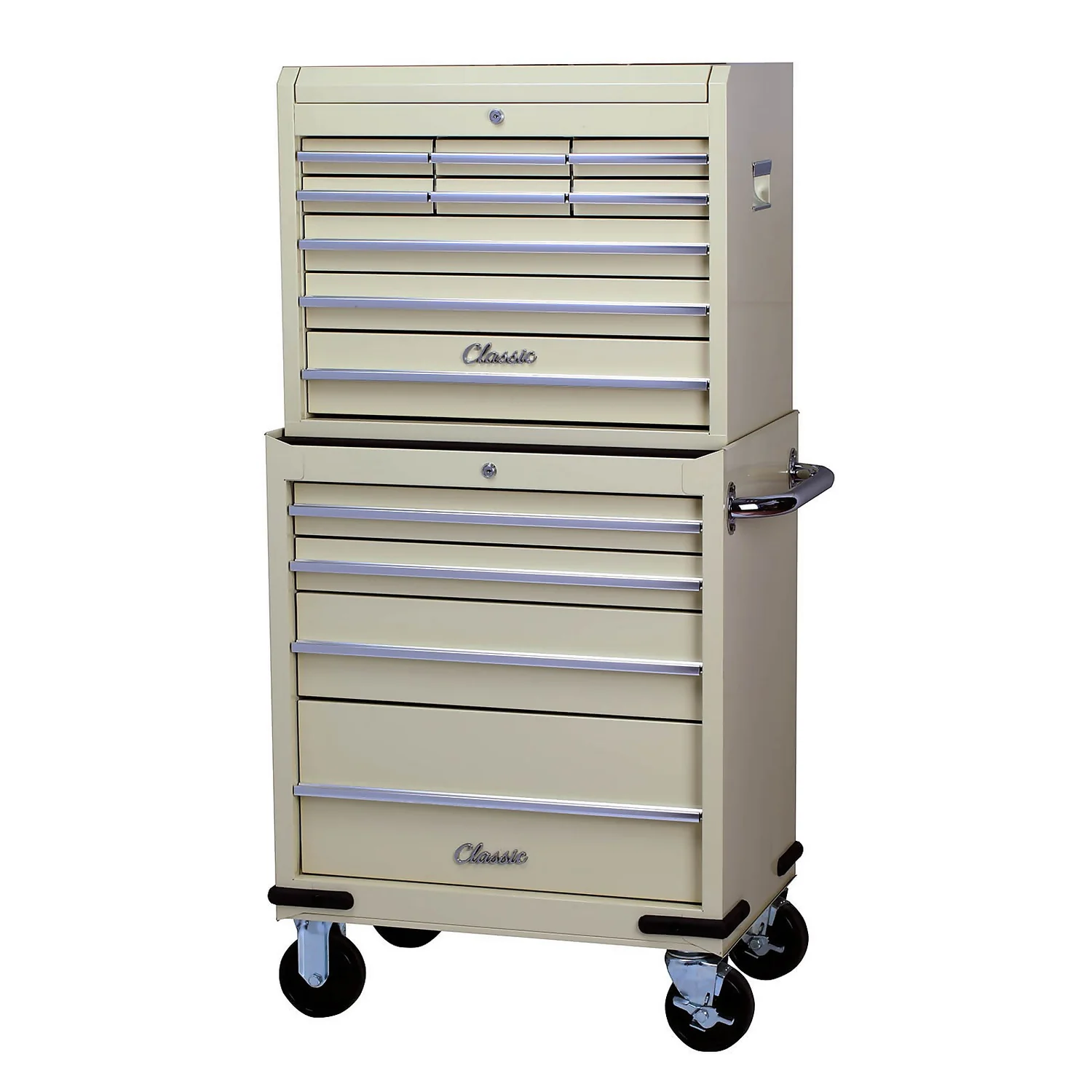 Classic 26″ combination unit design to suit classic car owners and car enthusiasts with gas struts, lift latch, 5″ locking castors and lockable ball bearing drawer slides for a smooth secure operation.