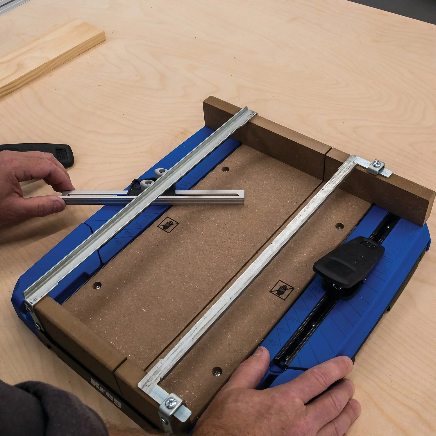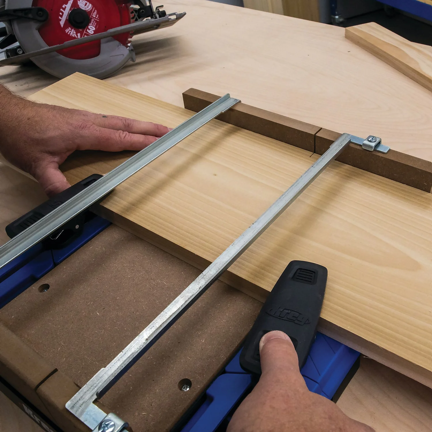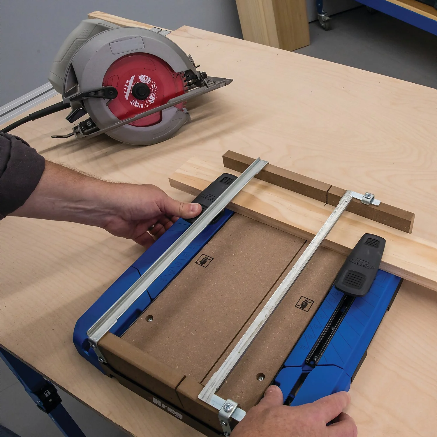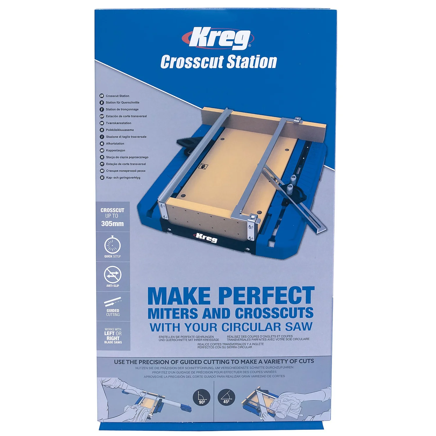 Get mitre saw quality from your circular saw. The Crosscut Station gives you the capabilities of a mitre saw with just a circular saw and Kreg guided cutting. Crosscut boards wider than most compound mitre saws can handle (up to 305mm at 90 degree). Make a variety of angle and mitre cuts from 0 degree to 45 degree with the adjustable fence and positive stops at 0 degree and 45 degree. An MDF base and Sure-Cut backboard act as a sacrificial surface for splinter-free cutting results. The MDF base also functions as a kerf line so you can clearly see the blades path and know exactly where your saw will cut every time. Use material support wings and the detachable blocks to cut long boards safely by supporting your offcuts. They pull out easily when more support is needed, and tuck back in when not in use. The Crosscut Station is quick to set up and easy to store away. Its compact design even makes it portable when you need accurate crosscuts and angle cuts on the go.