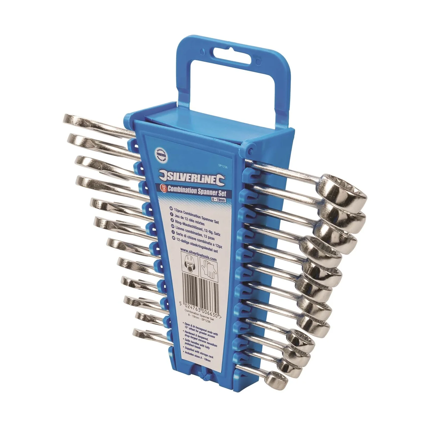 This handy 12 piece Combination Spanner Set from Silverline offers a range of popular sizes from 8 – 19mm. Each spanner features an open end and a bi-hexagonal end for versatility, with a 15° offset for accessing hard-to-reach nuts and bolts.