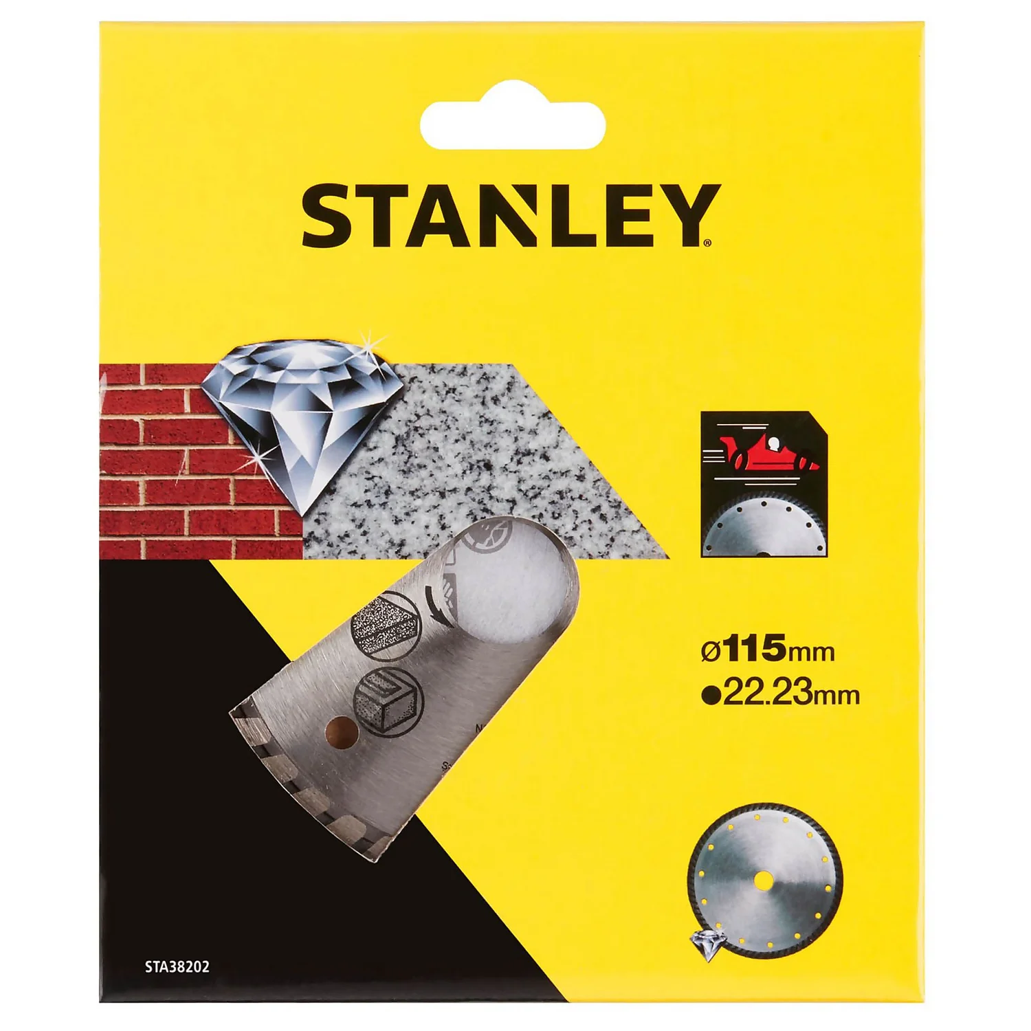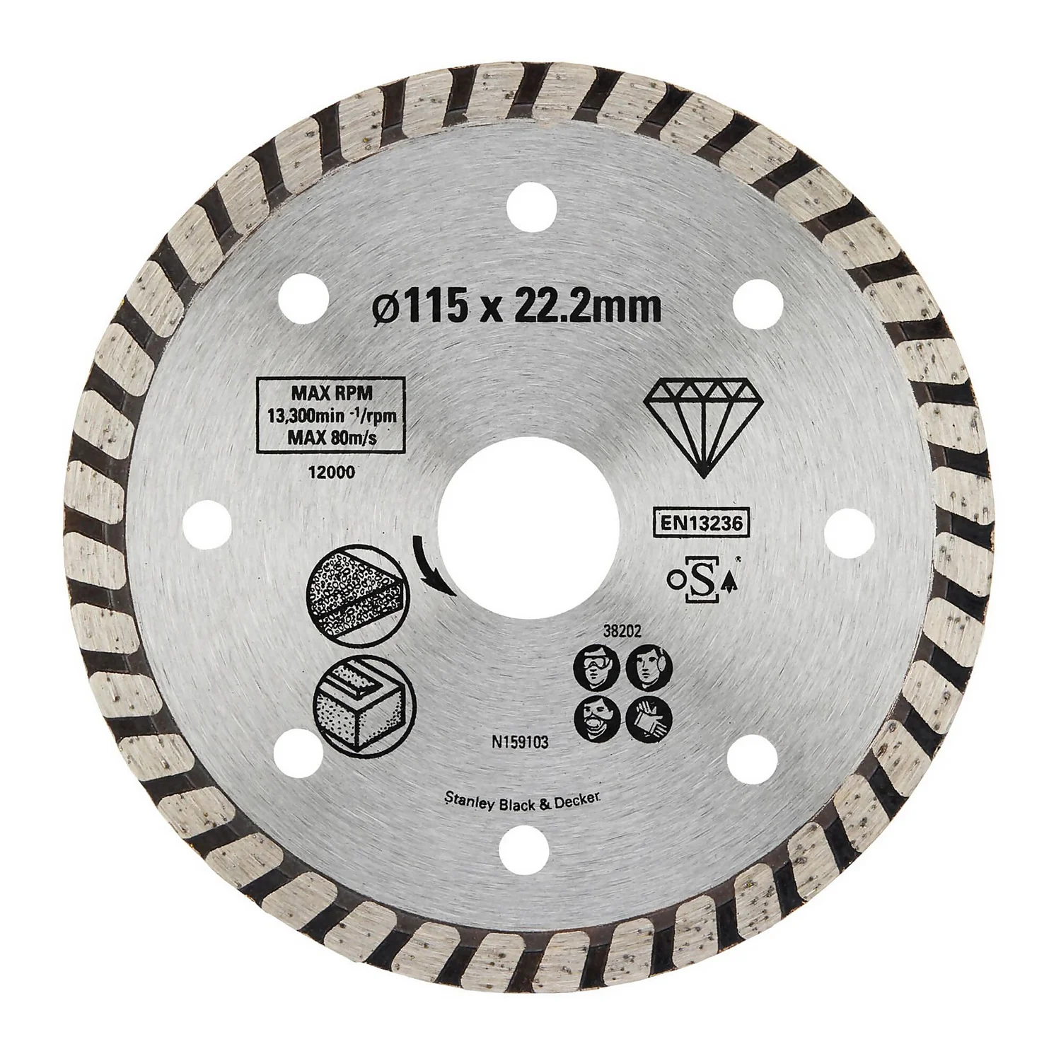 The Stanley 115mm Continuous Turbo Rim Cutting Disc has been designed for heavy duty intensive and prolonged cutting of hard materials. The diamond continuous turbo rim can be used for fast and clean cutting of granite and brick. The cutting disc is suitable to attach to most 115mm disc angle grinders.