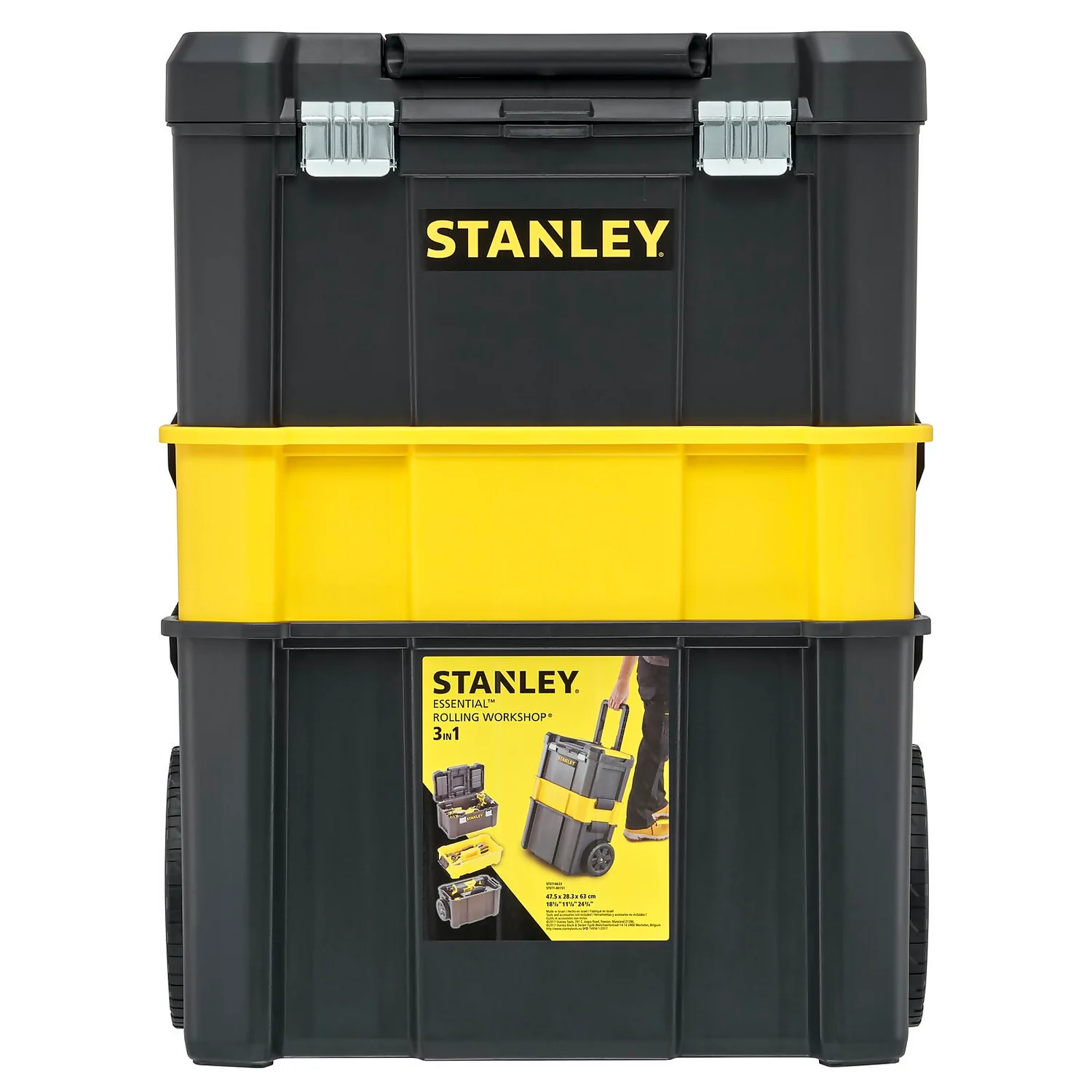 The STANLEY rolling workshop has been designed for DIY-ers and anyone that would require limitless customised storage around the home. Comes with Large bin, Middle tray module, Toolbox, Tote tray.