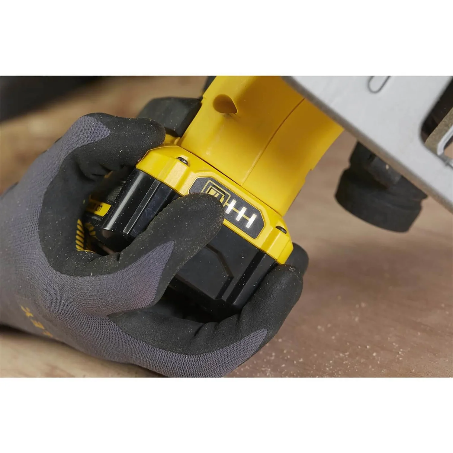 - Tool-free bevelling shoe pivots up to 50° for angled cuts
