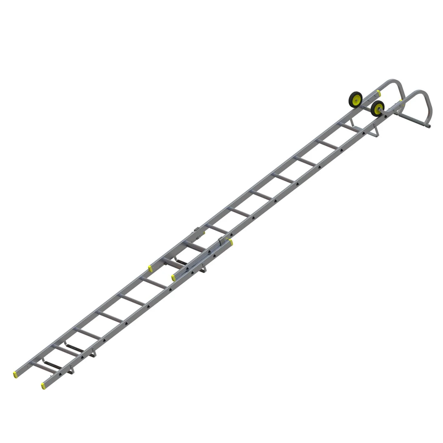 The Werner Double Section Roof Ladder 3.21m has an optimum weight frame for ease of positioning with no compromise on strength. Fitted with a heavy-duty roof hook with large non-slip rubber end bar for a superior apex fit. Heavy-duty locking catches and non-slip rubber sleeved support bars for roof protection. Large wheels for easy manoeuvring on roof. Compact for easy storage and transportation. Overall length 4.89m.